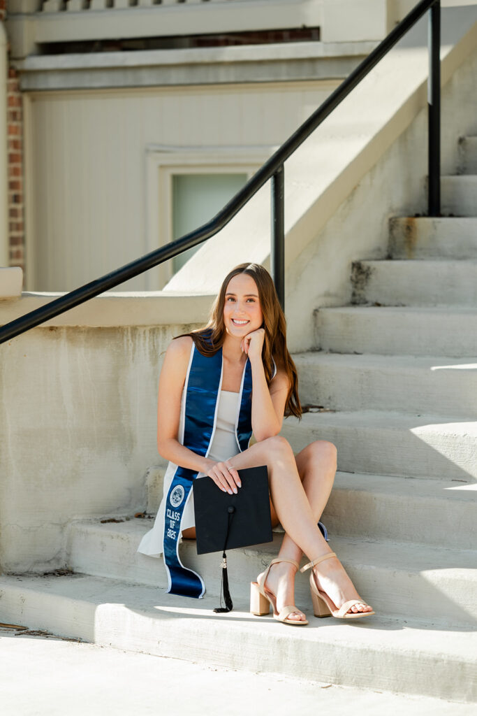 We started with the stole and dress for a clean, classic look that shows off school pride while still feeling natural and relaxed. Then we added the cap and gown for traditional graduation photos, which are always important to have.